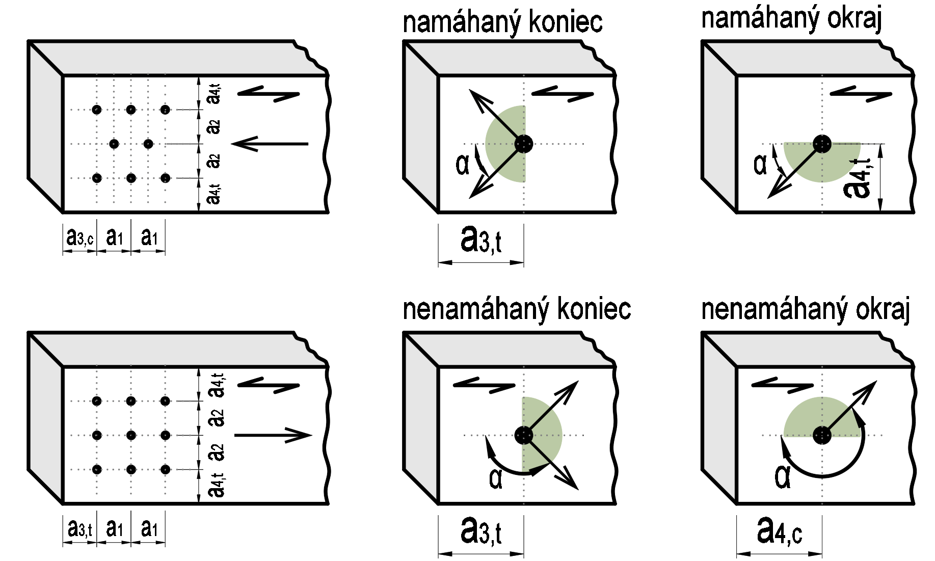 Rozostup a3,c nenamáhaný koniec dreva 90°≤α≤270°
